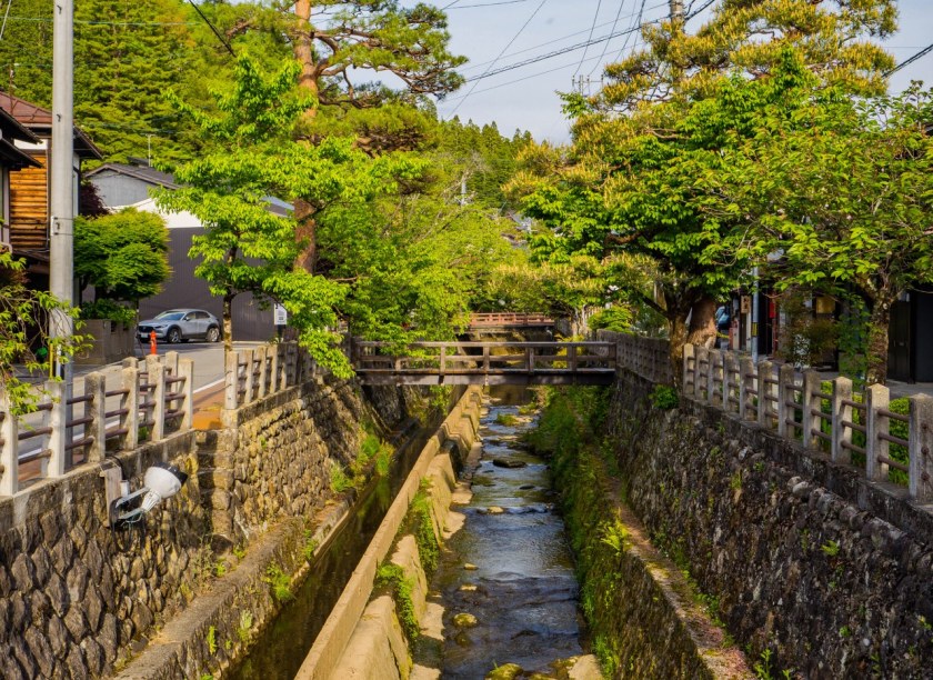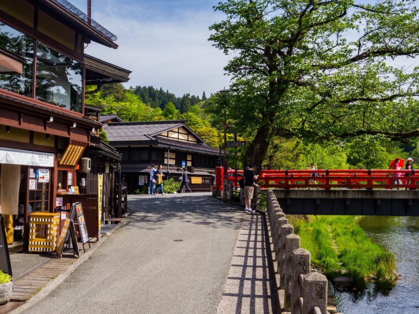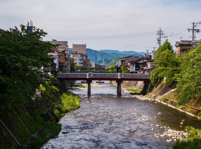 Prostopadle do drogi 158, z północy na południe przez miasto przemyka rzeka Jinzū, na większości map zobaczycie ją jednak pod inną nazwą – w prefekturze Gifu, w górnym jej biegu przyjęło się nazywać ją Miya. Widok na Miyagawę i szereg przerzuconych nad nią mostów jest dla Takayamy wręcz emblematyczny i prędzej czy później nad rzekę traficie. Fakt, jak w każdym większym japońskim mieście została ona ujarzmiona i trafiła w nieurodziwy betonowy uścisk, ale w kilku miejscach prezentuje się naprawdę ładnie, ot spojrzenie na najbardziej ikoniczny, czerwony Most Środkowy, Nakabashi, wraz z zielonym tłem w postaci pagóra Shiroyama to coś co naprawdę warto zobaczyć. Wiosną otoczenie cynobrowego Nakabashi mieni się wiśniowymi różami, jesienią jest tam zapewne ładne momiji, a niezależnie od pory roku przy moście czeka na was Han Jihwa, Kan Shiwa, legendarny (ale tak serio, serio) rzemieślnik i twórca drewnianych lalek karakuri, pojawiający się w starych chińskich podaniach z okresu dynasti Tang, najpewniej pochodzący z Hidy – brązowa rzeźba przedstawia go frunącego na wielkim żurawiu. Ponoć przed wiekami na takim właśnie drewnianym żurawiu dotarł do Chin i był to pierwszy z wiel cudów którymi zachwycił tamtejszy dwór cesarski.