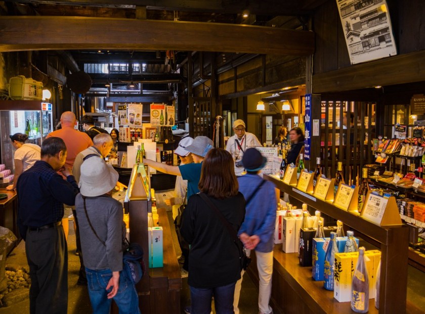 Co jakiś czas traficie na wystawy pełne butelek, i zawieszone nad wejściami kule z liści kryptomerii, sagidamma – to znak, że dotarło się miejscowego browaru sake. Takayama od setek lat słynie z ryżowego alkoholu, i choć dziś „branża” jest zdecydowanie szczuplejsza niźli w czasach prosperity to i tak jest to kierunek, który wielbicielom trunku bym polecił. Miejscowe browary, tradycją sięgające nawet 300 lat prześcigają się w zanęceniu przybyszów, organizują prelekcje i degustacje z kikisake-shi, sake-sommelierami, dają również możliwość próbowania na własną rękę – za bezcen otrzymuje się ceramiczny kieliszek i szereg sake do spróbowania. Co jest okazją do ciekawych interakcji z pozostałymi degustatorami 😀 Sam skusiłem się na browar Harada, założony na początku ery Meiji, charakteryzujący się używaniem drożdży pozyskiwanych z kwiatów (begonii, sakury czy goździków).