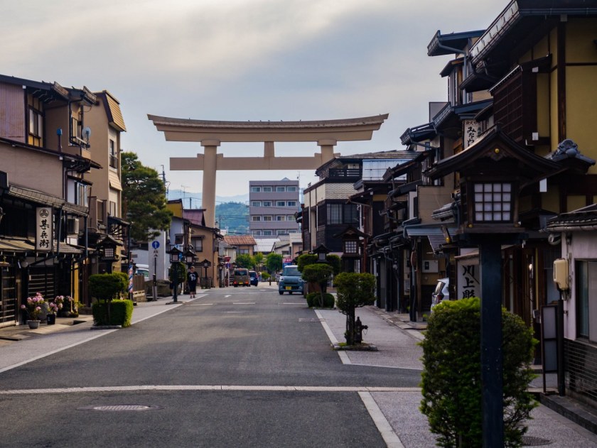 Takayama jest ciekawym i wyjątkowym przykładem miasta zamieszkałego przez niewielką – jak na japońskie standardy – liczbę mieszkańców a przy tym niebotycznie wręcz rozległego: przeszło 2 tysiące kilometrów kwadratowych jest domem dla zaledwie 80 tysięcy osób! Tak, kto nie czytał poprzedniego wpisu niechaj wie, że od kilkunastu lat, po fuuuuuuzji z kilkoma sąsiednimi wsiami i miasteczkami obszar Takayamy rozrósł się do rozmiarów dorównujących Tokio. I jest to taki ciekawy administracyjnie twór, rozciągający się przez niemal całą szerokość prefektury Gifu (jej północnej części, równej niemal 80 kilometrom) gdzie historyczna Takayama wraz z wchłoniętymi wsiami jest li tylko niewielką zurbanizowaną wyspą otoczoną przestworem potężnych, nierzadko trudno dostępnych, zalesionych gór, Północnych Alp Japońskich i Ryohaku. Jaka to jest jednak wspaniała wyspa! Opasana niekończącymi się lasami słynie ze zjawiskowego i zabytkowego centrum, niezliczonych świątyń i chramów, jednego z trzech najpiękniejszych w Japonii festiwali, rzemiosła artystycznego najwyższych lotów, pierwszorzędnej kuchni i niezwykle przyjaznych mieszkańców. Ze wspaniałymi tradycjami tamtejszego matsuri spotkaliśmy się w poprzednim tekście, teraz pora na spokojny spacer uliczkami Starego Miasta.