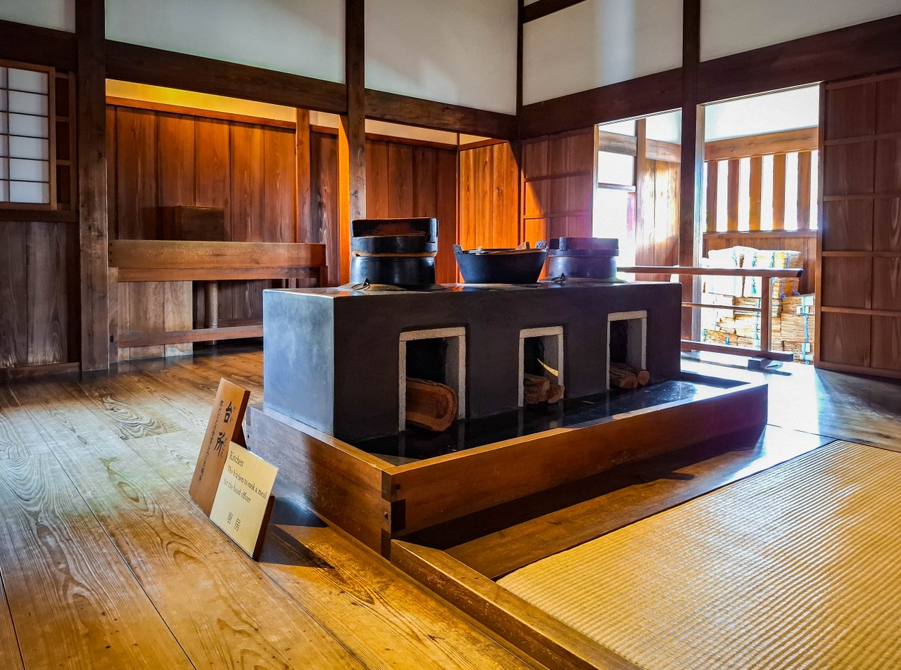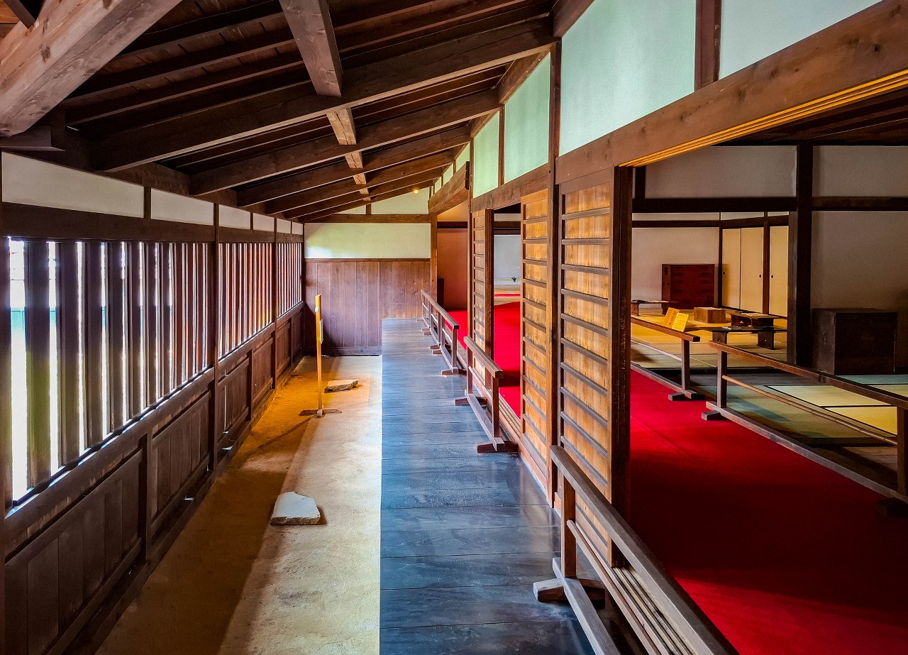 Zwiedzania feudalnych posiadłości nigdy dość i również tutaj czułem się jak ryba w wodzie. Kompleks jest sporawy, składa się nań budynek główny, piękny japoński ogród i jeden z największych w Japonii spichlerzy na ryż, służący dziś za halę wystawową. Główny budynek zaskakuje wielkością, ilością pomieszczeń i tym, że kiedy już wydaje się, że trafiło się do ostatniego to pojawia się wąskie przejście do kolejnego. Chowając buty do siatki/plecaka spacerujemy po drewnianych podłogach i matach tatami podziwiając drewnianą konstrukcję, zaglądamy do miejsc pracy zarządcy, sędziego i innych urzędników (z jakiegoś powodu największe szychy miały dostęp do widoku na ogród), ich komnat, kuchni, aresztu (przyjrzyjcie się koszowi na… przestępcę), no i przede wszystkim wracamy na skraj ogrodu, siadamy i kontemplujemy piękny widok.