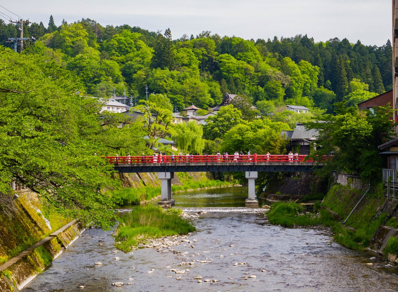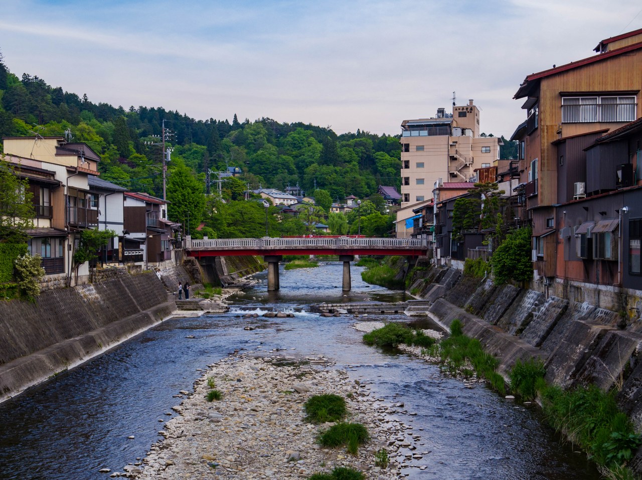 Prostopadle do drogi 158, z północy na południe przez miasto przemyka rzeka Jinzū, na większości map zobaczycie ją jednak pod inną nazwą – w prefekturze Gifu, w górnym jej biegu przyjęło się nazywać ją Miya. Widok na Miyagawę i szereg przerzuconych nad nią mostów jest dla Takayamy wręcz emblematyczny i prędzej czy później nad rzekę traficie. Fakt, jak w każdym większym japońskim mieście została ona ujarzmiona i trafiła w nieurodziwy betonowy uścisk, ale w kilku miejscach prezentuje się naprawdę ładnie, ot spojrzenie na najbardziej ikoniczny, czerwony Most Środkowy, Nakabashi, wraz z zielonym tłem w postaci pagóra Shiroyama to coś co naprawdę warto zobaczyć. Wiosną otoczenie cynobrowego Nakabashi mieni się wiśniowymi różami, jesienią jest tam zapewne ładne momiji, a niezależnie od pory roku przy moście czeka na was Han Jihwa, Kan Shiwa, legendarny (ale tak serio, serio) rzemieślnik i twórca drewnianych lalek karakuri, pojawiający się w starych chińskich podaniach z okresu dynasti Tang, najpewniej pochodzący z Hidy – brązowa rzeźba przedstawia go frunącego na wielkim żurawiu. Ponoć przed wiekami na takim właśnie drewnianym żurawiu dotarł do Chin i był to pierwszy z wiel cudów którymi zachwycił tamtejszy dwór cesarski.