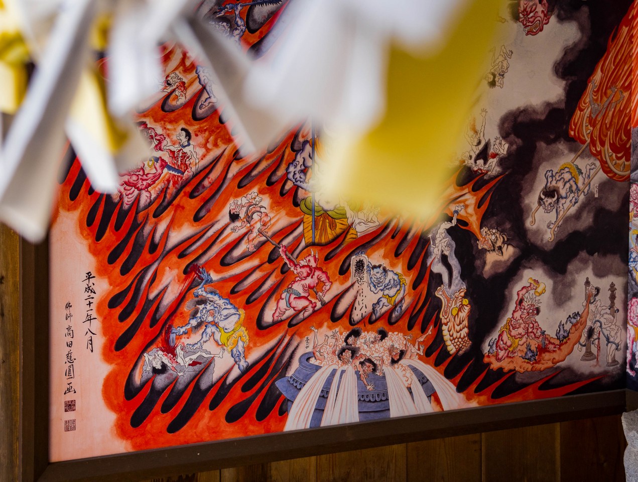 Higashiyama Walking Course (東山遊歩道) na ten przykład, ze wszystkimi swymi świątyniami, chramami, szlakiem ciągnącym się do sąsiedniego parku Shiroyama, wspinającym się do ruin dawnego zamku klanu Kanamori to pomysł na naprawdę fajne popołudnie. Dla mnie niestety było już trochę za późno na 4 kilometry spaceru, ale wam jak najbardziej polecam. Tu zresztą już samo spotkanie z kilkoma świątyniami na skraju lasu robi robotę. Niewielkie buddyjskie zespoły, choć wydają się niepozorne są powiernikami wielkiej historii. Ot, Unryu-ji, jak się okazuje pierwsza świątynia Soto Zen w Hidzie, była rodzinną świątynią klanu Kanamori, w pewnym sensie najważniejszą świątynią u zarania takajamskiej miastowości. Niezwykle estetyczne miejsce, spokojne, wraz z sąsiednią świątynią Daio-ji idealne do zatrzymania się, chłonięcia chwili. Daio-ji pochwalić się może najstarszą dzwonnicą w mieście, co przy częstych pożarach nawiedzających tę część miasta jest rzeczą nie byle jaką. Pośród kwitnących roślin, kwiatów uwagę przykuwają pomniki, rzeźby czy obrazy im towarzyszące – te w Sali Dziesięciu Królów uzmysławiają nam, że religie mogą być różne, ale w każdym piekle prędzej czy później trafisz do wielkiego gara z wrzątkiem 😀