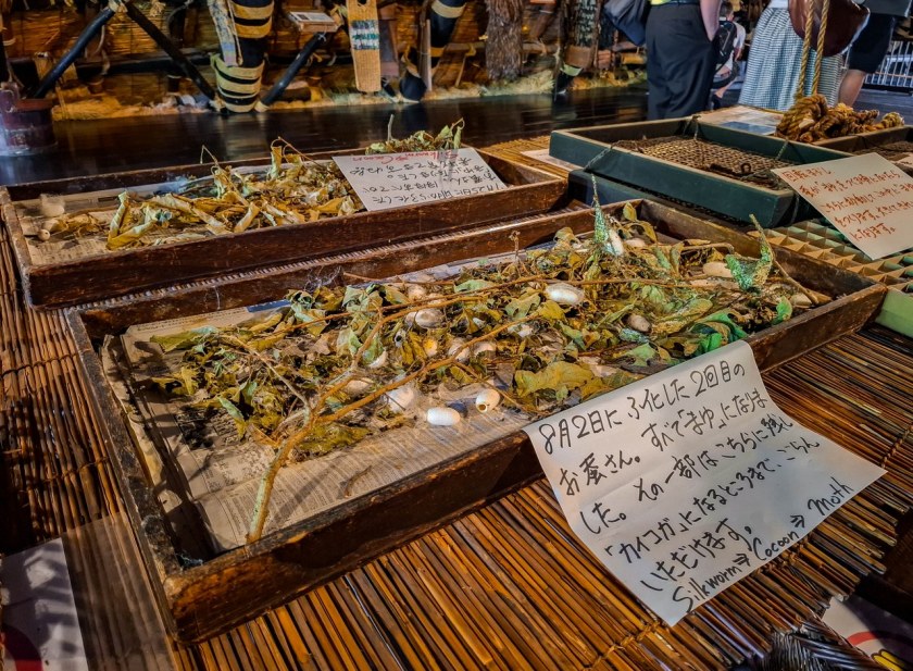 Wszystkie budynki można zwiedzać. W niektórych czekają na was ekspozycje, tak o historii nieistniejących już wsi, o życiu codziennym w dolinie, o rzemiosłach innych niż jedwabnictwo, jak macie chwilkę to w jednym z domów można obejrzeć nawet i film dokumentalny. Odkryjecie też, że nie zawsze trzeba było budować kilkupiętrowe domy by zapewnić jedwabnikom miejsce do pracy. Do tego w przestrzennych, gościnnych wnętrzach rezydencji rodziny Nakano Chojiro możecie napić się herbaty oraz spróbować słodkiego specjału zenzai, takiego zupo-deseru opartego na czerwonej fasoli adzuki z wkładką w postaci mochi. Czy zaskoczę was jeśli powiem, że i tu ludzi było jak na lekarstwo?