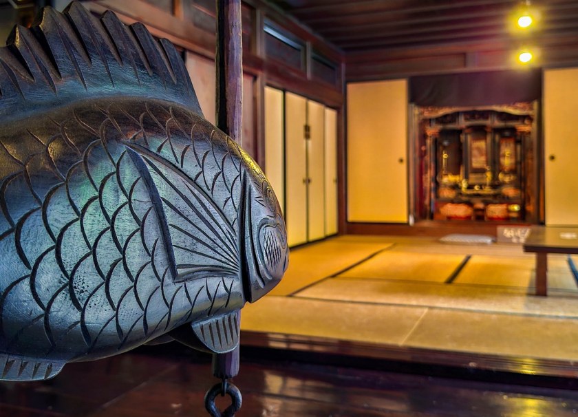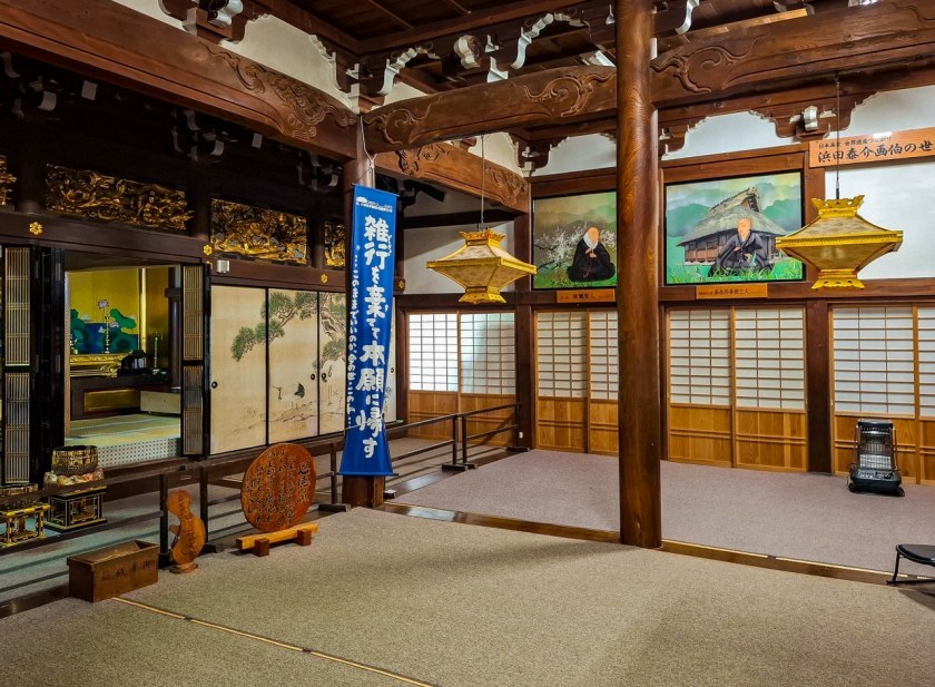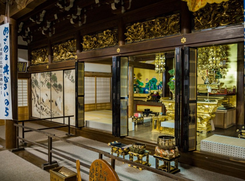 Myozen-ji to w zasadzie nie budynek a cały, liczący sobie 200 lat buddyjski kompleks. Najważniejsza buddyjska świątynia Shirakawa-go historię ma nawet dłuższą aczkolwiek jej główny pawilon, również kryty strzechą, wybudowany został w roku 1827 – za rok piękna, okrągła rocznica się szykuje. Niezwykle stylowy to pawilon, z takim małym fragmentem fasady, której nie powstydziłyby się najładniejsze domy z muru pruskiego. Wnętrza, do których dociera się niemal na samym końcu zwiedzania, nie pozostają w tyle – rzeźbione drewno zdradza kunszt budowniczych, o uwagę walczą malunki na przesuwnych drzwiach fusuma, jak i obrazy na ścianach, a w tym wszystkim, ołtarz, może i cały na złoto, ale jakiś taki wycofany, skrywający Buddę Amidę.