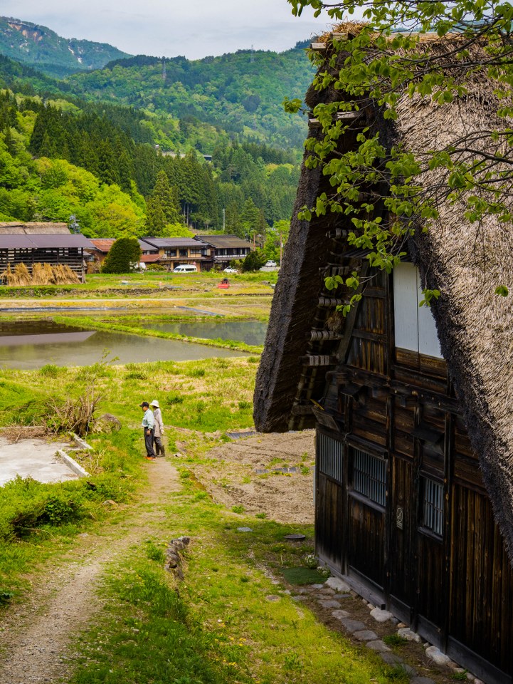 Przybywając na miejsce pierwszym (bądź drugim) autokarem, jeszcze przed pierwszymi zorganizowanymi wycieczkami, Ogimachi wydaje się wioską wręcz senną. W moim przypadku było przed 9 rano, do otwarcia pierwszych kawiarni i restauracji pozostawała godzina (na późne śniadanko polecam Shirakawago Restaurant Irori, gdzie zamówić można tak fajny secik śniadaniowy, sporo vege wariantów soby czy np. udon curry z wołowiną Hida), pojedynczy mieszkańcy rozpoczynali poranne doglądanie swoich poletek i ogródków. Powiem wam, że w takim spokojnym i kameralnym wydaniu było dosko, a myślę, że jesienią, z nisko zawieszonymi chmurami byłoby w ogóle obłędnie (choć tłoczniej). No nie miałem na co narzekać: domy gasshō, majowa, soczysta zieleń i wysokie góry pokryte resztkami śniegu świetnie się uzupełniały.