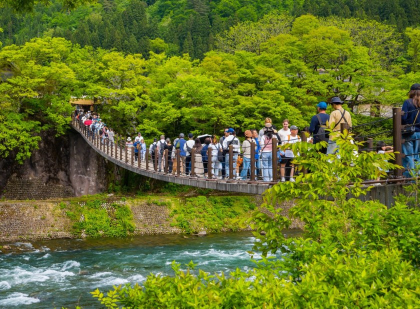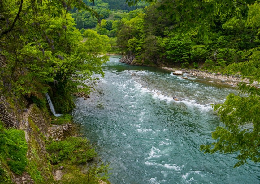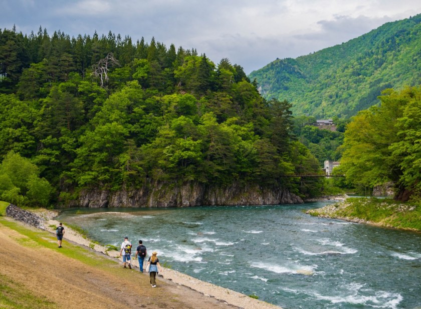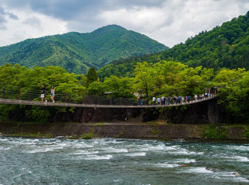 Spod chramu już tylko żabi skok do drugiego z miejsc generujących największy tłok: kamiennego, wiszącego mostku Deai nad rzeką Shō. Dzieje się tak z trzech prostych powodów: jest on wąski, tuż obok jest wielki parking, no i jest on tym z mostów (bo jest ich w wiosce kilka), który najszybciej i najefektywniej łączy najciekawsze atrakcje po obu brzegach rzeki. Co nie jest rzeczą trudną bo tak jak na wschodnim brzegu Ogimachi mamy pełnoprawną wioskę z całym wachlarzem ciekawostek tak na zachodnim brzegu atrakcja… jest w sumie jedna. Jedna, ale rozbudowana, idealnie nadająca się do bycia „kropą nad I”. Po przejściu mostu wystarczy zrobić krok (znaczy przejść 100 metrów) by doń trafić.