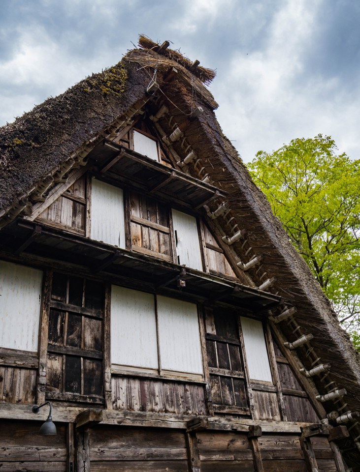 Wysokie nawet i na kilkanaście metrów, jedno, dwu, trzy a nawet czteropiętrowe domy powstawały bez użycia gwoździ (te raz po raz pojawiły się wiele lat później przy różnych mniejszych pracach), dając pole do popisu rzemieślnikom, w najróżniejszy sposób łączącym poszczególne drewniane elementy, na poddaszach wzmacniając je wiązaniami neso oraz słomianymi linami – wizyta na jednym z takich poddaszy i spojrzenie na więźbę dachową, pełną wymyślnych rozwiązań pozwala docenić ich robotę. I jakkolwiek duże części budynków całkiem nieźle znoszą upływ czasu to nie można tego powiedzieć właśnie o samej strzesze, która co 20-30 lat musi być wymieniana – dawniej była to broszka tylko miejscowych, którzy organizowali się w grupy zwane kumi i sami przeprowadzali remont, dziś zajmują się tym też i profesjonalne firmy. Ach, trafić tu w czasie takie renowacji, bezcenne. Swoją drogą życie społeczne w dawnej dolinie – kolektywne prace w duchu yui, gdzie każdy wyznaczony ma swoje miejsce i rolę, specyfika dawnego modelu rodziny (relacje mąż-żona-rodzice-teściowie) w dużej mierze zależna… od jedwabniczego przemysłu – samo w sobie jest materiałem na osobną opowieść.