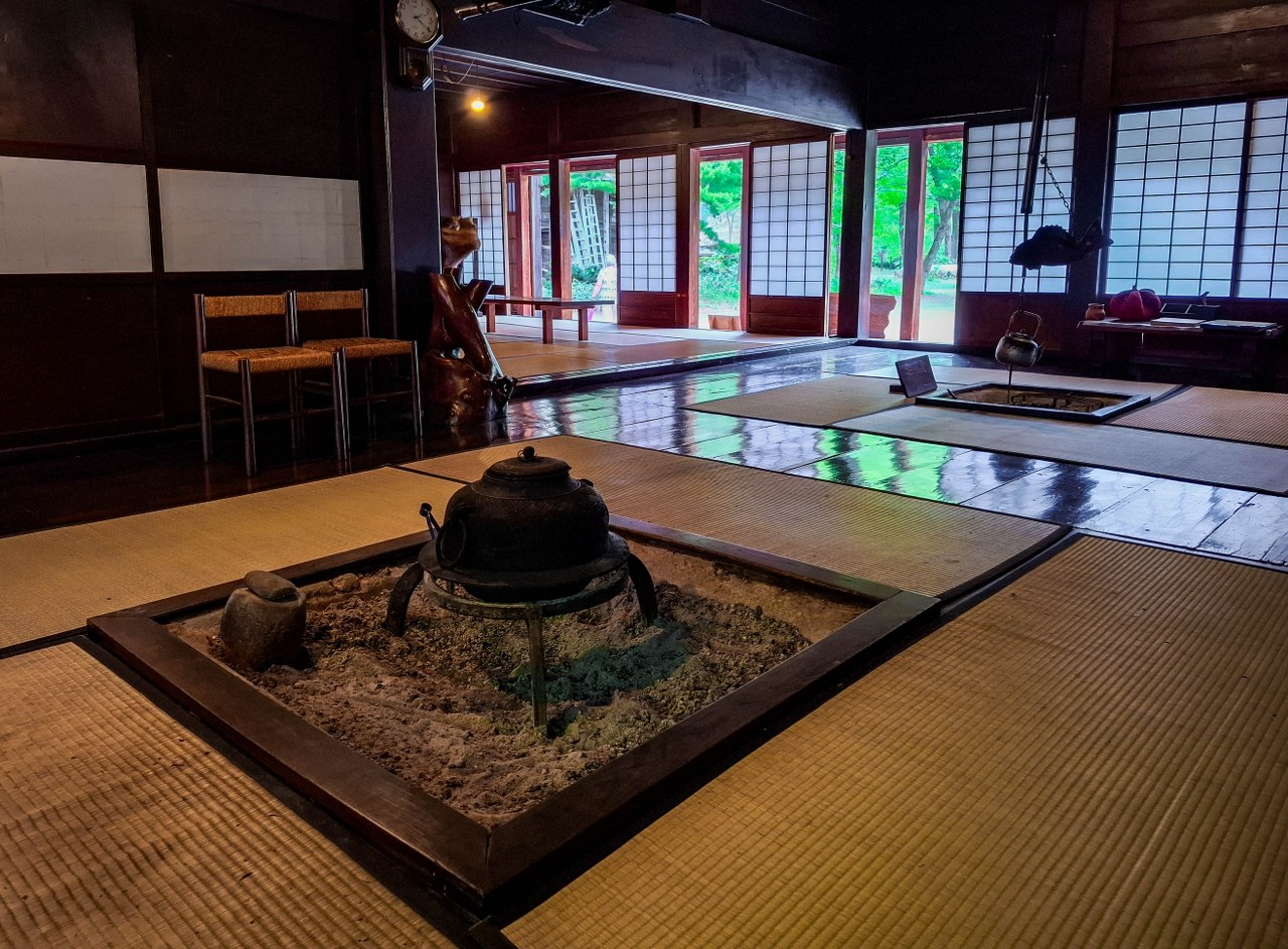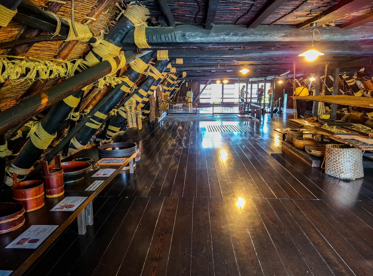 Tym co jednak robi jeszcze większe wrażenie jest sąsiadujący z pawilonem, wielgaśny czteropiętrowy dom (pełniący funkcję muzeum), którego ważnym elementem jest kuri, komnaty kapłana, jego rodziny a także – a może przede wszystkim – salon z paleniskiem irori. Niepozorny kominek jest tutaj bohaterem, bo dzięki niemu zwiedzanie wyższych pięter przypomina spacer po wędzarni. Uciekający z niższych pięter dym był jednym z elementów kluczowych dla jedwabników starających się przetrwać mroźne zimy doliny, dziś spowite w lekkiej mgiełce poddasze służy edukacji – dwa piętra pełne eksponatów, jeszcze bardziej niż w Domu Wada przybliża życie lokalnej społeczności.