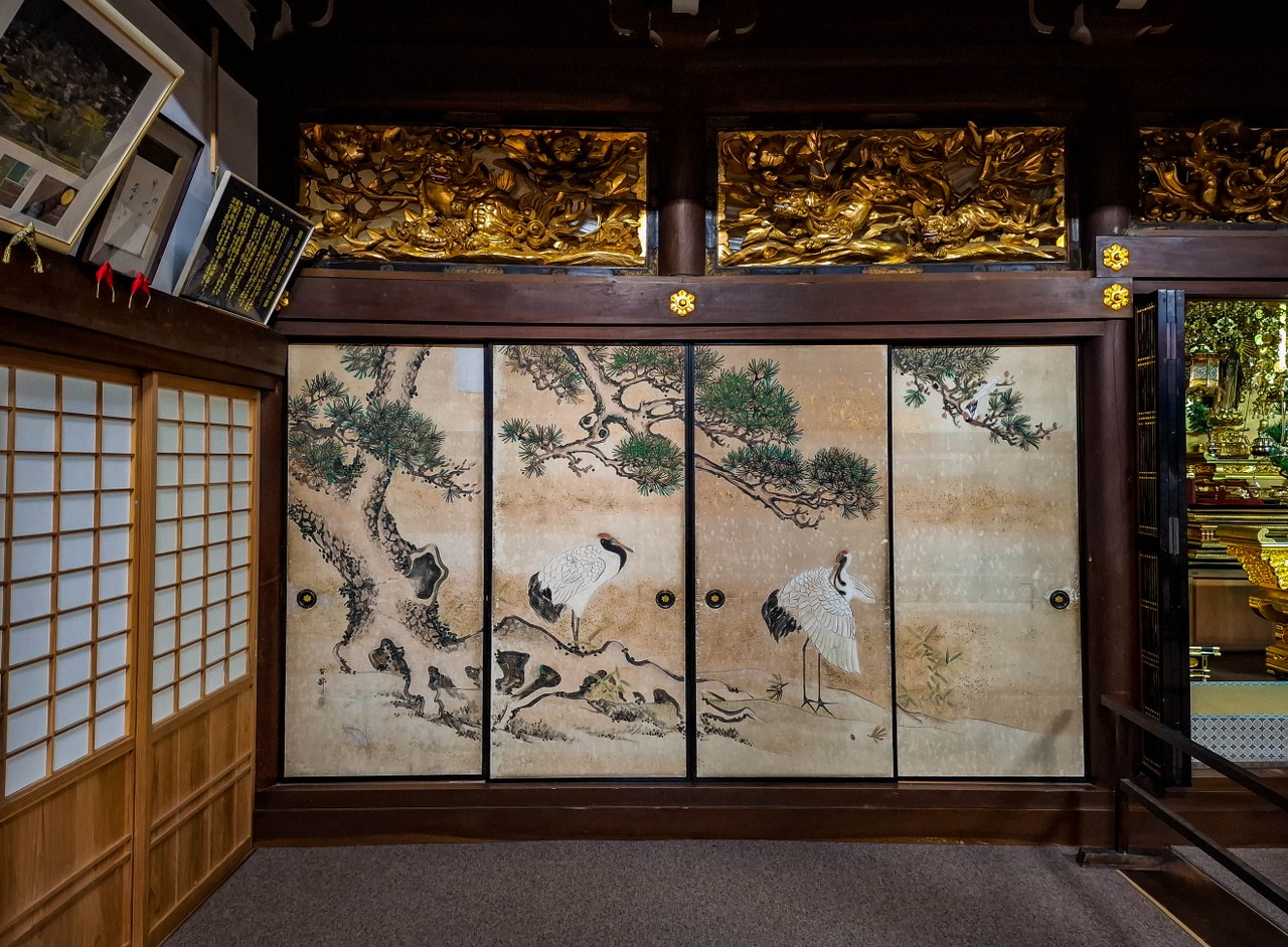Myozen-ji to w zasadzie nie budynek a cały, liczący sobie 200 lat buddyjski kompleks. Najważniejsza buddyjska świątynia Shirakawa-go historię ma nawet dłuższą aczkolwiek jej główny pawilon, również kryty strzechą, wybudowany został w roku 1827 – za rok piękna, okrągła rocznica się szykuje. Niezwykle stylowy to pawilon, z takim małym fragmentem fasady, której nie powstydziłyby się najładniejsze domy z muru pruskiego. Wnętrza, do których dociera się niemal na samym końcu zwiedzania, nie pozostają w tyle – rzeźbione drewno zdradza kunszt budowniczych, o uwagę walczą malunki na przesuwnych drzwiach fusuma, jak i obrazy na ścianach, a w tym wszystkim, ołtarz, może i cały na złoto, ale jakiś taki wycofany, skrywający Buddę Amidę.