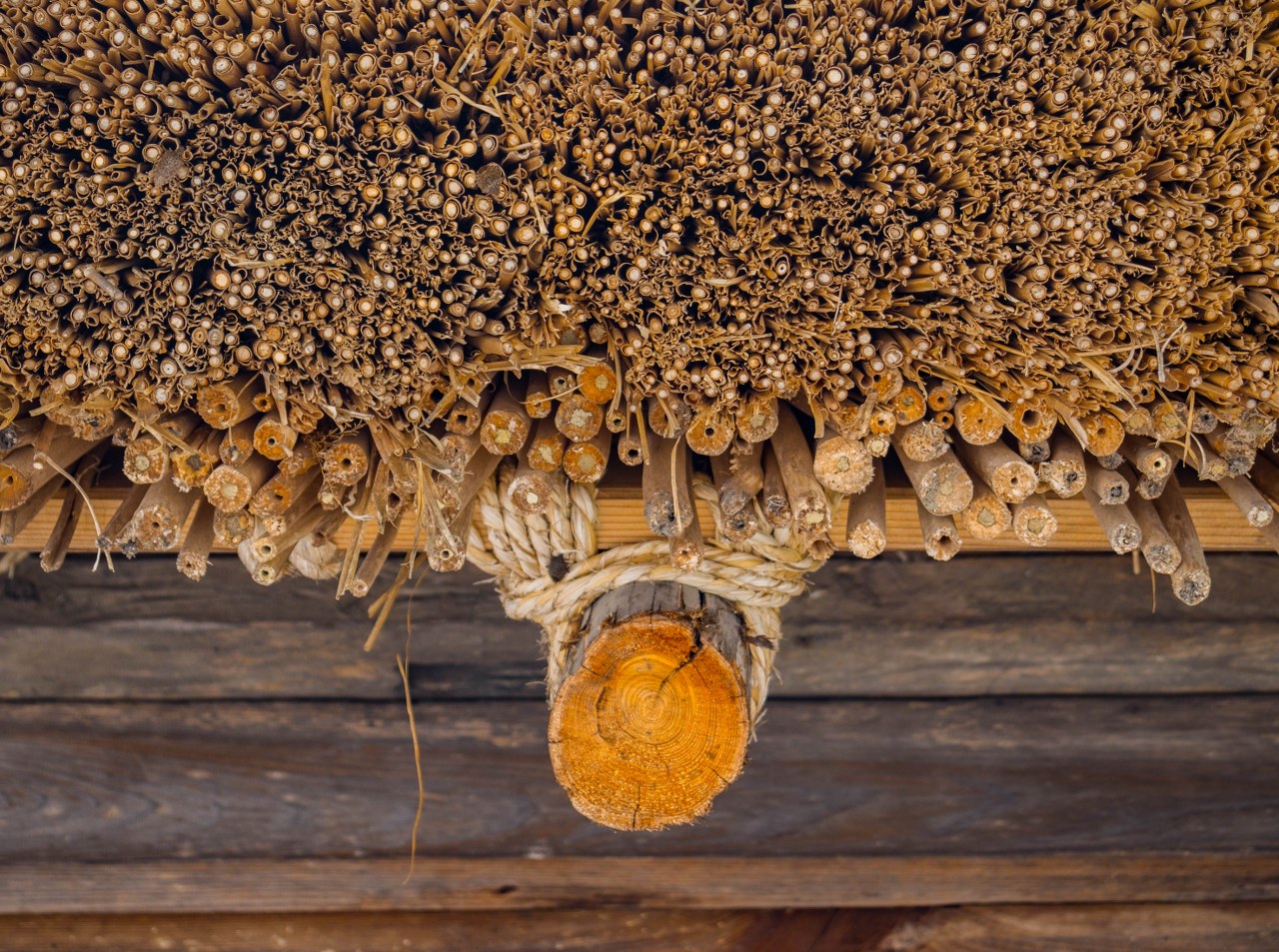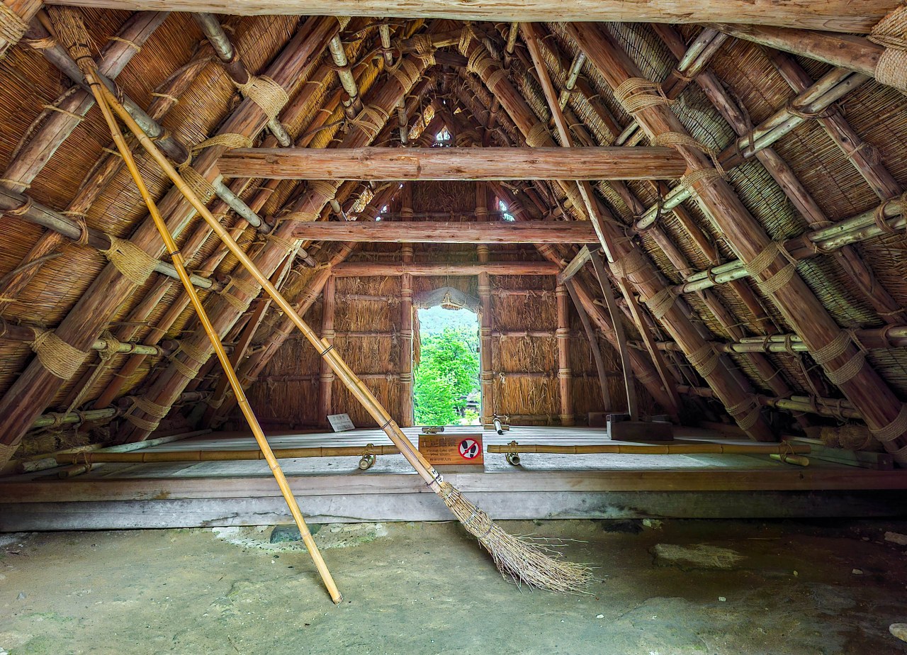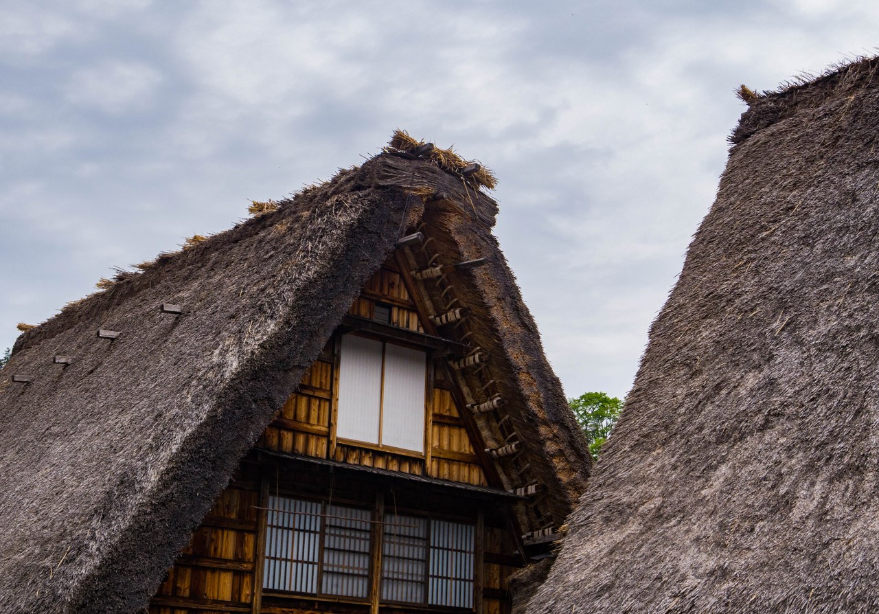 Wysokie nawet i na kilkanaście metrów, jedno, dwu, trzy a nawet czteropiętrowe domy powstawały bez użycia gwoździ (te raz po raz pojawiły się wiele lat później przy różnych mniejszych pracach), dając pole do popisu rzemieślnikom, w najróżniejszy sposób łączącym poszczególne drewniane elementy, na poddaszach wzmacniając je wiązaniami neso oraz słomianymi linami – wizyta na jednym z takich poddaszy i spojrzenie na więźbę dachową, pełną wymyślnych rozwiązań pozwala docenić ich robotę. I jakkolwiek duże części budynków całkiem nieźle znoszą upływ czasu to nie można tego powiedzieć właśnie o samej strzesze, która co 20-30 lat musi być wymieniana – dawniej była to broszka tylko miejscowych, którzy organizowali się w grupy zwane kumi i sami przeprowadzali remont, dziś zajmują się tym też i profesjonalne firmy. Ach, trafić tu w czasie takie renowacji, bezcenne. Swoją drogą życie społeczne w dawnej dolinie – kolektywne prace w duchu yui, gdzie każdy wyznaczony ma swoje miejsce i rolę, specyfika dawnego modelu rodziny (relacje mąż-żona-rodzice-teściowie) w dużej mierze zależna… od jedwabniczego przemysłu – samo w sobie jest materiałem na osobną opowieść.