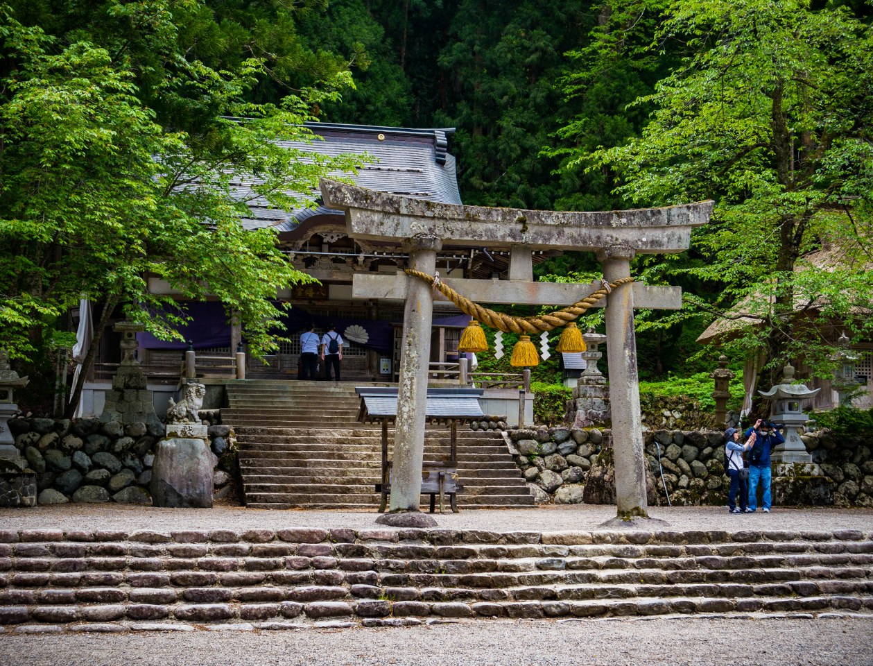 Tak jak najważniejszą, buddyjską świątynią jest Myozen-ji, tak wyznawcy shinto swe kroki skierują przede wszystkim do chramu Shirakawa Hachiman. Oddalony, skryty na skraju lasu, początkami sięgający ponoć VIII-wieku, swą obecną formę zawdzięcza Yamashicie Ujikatsu, samurajowi wiernemu siogunom z Edo. Za czasów Tokugawów chram urósł do rangi najważniejszego w całej dolinie, podczas restauracji Meiji zasłynął niewzruszeniem na shinbutsu hanzenrei, czyli przelewający się przez cały kraj ruch rozdzielenia buddyzmu od shinto – dzięki czemu do dziś w głównym pawilonie chramu znajduje się rzeźba Buddy ufundowana przez Ujikatsu. Nieżle.