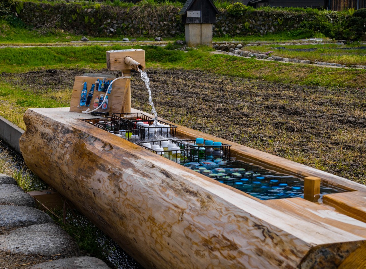 I ja nie wiem, może miałem szczęście, ale po tym jak czytałem o tych wszystkich tłumach odbierających przyjemność z poznawania Shirakawa-go to mam pytanie: gdzież one? Skoro najważniejsze domy razem ze mną zwiedzało kilka osób (a przez długi czas nikt mi nie towarzyszył) a na spacerze częściej byłem sam, niźli z innymi zwiedzającymi to chyba coś tu nie gra. A może te parę wcześniejszych dni, nierzadko wśród tłumów, zmieniło mi optykę? 10 dni wcześniej podczas Złotego Tygodnia bym pewnie klął na czym świat stoi. No w każdym razie wydaje mi się, że w ciągu tygodnia (byłem w piątek, więc na skraju weekendu), jeśli nie ma żadnego święta to jest tu naprawdę fajnie i nie powiem złego słowa na klimat w wiosce – a otaczające nas zielone lasy i monumentalne góry tylko dodają uroku, zawsze. A jeśli gdzieś traficie na zbiorowisko ludzi, to w okolicach tych największych domów i… budek z żarełkiem (i w jeszcze jednym do, którego zaraz przejdziemy). 😀 No w końcu, z pustym brzuchem źle się zwiedza,prosta sprawa – a tu można np. kiełbaskę z wołowiny Hida popić miejscowym winem, prosto z drewnianej wanienki, chłodzonej górską wodą.