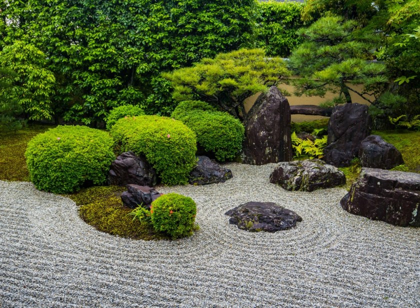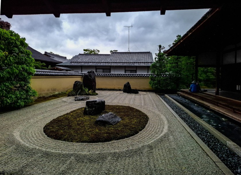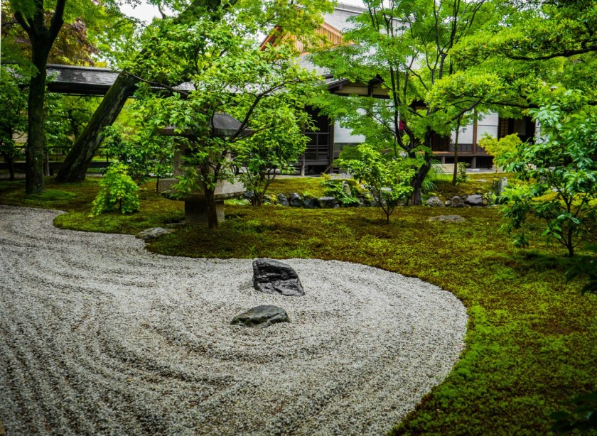 Daitoku-ji jest kompleksem przepastnym, poprzecinanym siatką ścieżek prowadzących do kolejnych, ogrodzonych murkami pod-świątyń. Potencjalnie łatwo się zgubić, ale chyba straszniej wygląda to na mapie, niż w rzeczywistości. Teren świątynny bucha zielenią, a jednak, o ironio , najbardziej zapamiętuje się zeń ogrody, w których zieleń owa redukowana jest do minimum, do roli tła, dodatku. O tak, wszystkie pod-świątynie jak jeden mąż (czy też brat) zachwycają ogrodami suchego krajobrazu, karesansui, kwintesencją inspiracji zen w japońskim ogrodnictwie. Przewrotne w swym zamyśle, przemyślane a jednak akceptujące niedoskonałości, pełne symboliki, oszczędne w formie, proste a angażujące, stworzone nie do spacerowania a kontemplacji i medytacji, jak na mój prosty rozumek idealnie sprzyjające byciu „tu i teraz”. Zaprojektowane tak przed stuleciami przez największych mistrzów, jak i reinterpretowane przez mistrzów współczesnych.