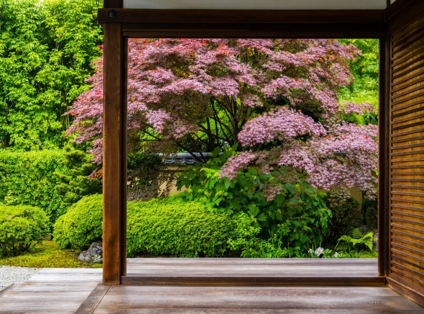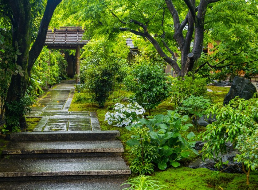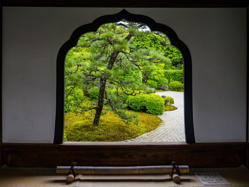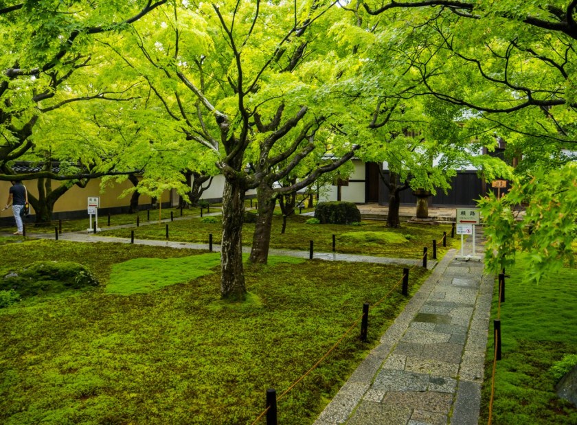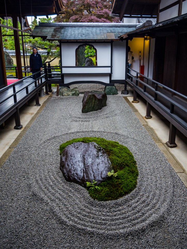 Ogrody trzech odwiedzonych przeze mnie pod-świątyń – choć mniejsze, bardziej kameralne i niekiedy bardziej minimalistyczne niż słynniejsi krewni z największych świątyń Kioto – robią piorunujące wrażenie, przede wszystkim tym, że atmosfera przy nich panująca uderzała we wszystkie nuty sprzyjające medytacji. Towarzyszyły mi jedna, maksymalnie dwie osoby, każdy miał miejsce dla siebie, swoją przestrzeń, czas. Nie trzeba było się śpieszyć, miast tego powoli chłonąć to co nas otacza. W świątyni Ryogen-in ogrodów do wyboru jest aż pięć, każdy totalnie inny, o symbolice zdawkowo, ale wystarczająco opisanej na ulotce, otrzymywanej przy kupnie biletu. Znajdziecie tu najstarszy ogród suchego krajobrazu w Daitoku-ji, jak i najmniejszy w całej Japonii.