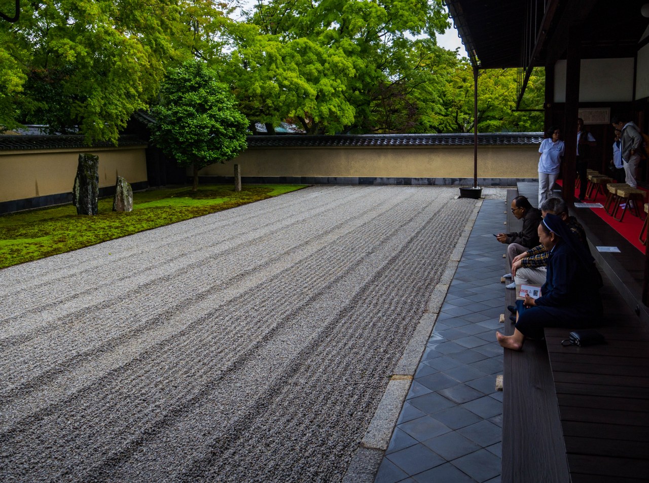 Historia świątyni sięga XIV wieku i pełna jest wzlotów i upadków, idealnie wpisując się w hasło „łaska pańska na pstrym koniu jeździ”. No bo tak: z początku pod przychylnym okiem cesarzy wyniesiona ponad Pięć Wielkich Świątyń Zen, chwilę potem popadająca w niełaskę siogunatu Ashikaga, splądrowana w czasie wojny Ōnin, odbudowana i przyciągająca największych mistrzów komponujących ogrody suchego krajobrazu i doskonalących ceremoniał picia herbaty, wspierana przez kolejnych cesarzy, daimyo i potężne rodziny wpływowych handlarzy, pierwotnie wzgardzona przez Tokugawów finalnie znajdująca w ich oczach uznanie, ostatecznie rozbudowana do gargantuicznych rozmiarów i kompleksu przeszło 20 pod-świątyń. Kompleks to niesamowicie piękny i na szczęście dostępny… tylko w nieznacznej części – gdyby było inaczej to na zwiedzaniu można by tu spędzić cały dzień 🙂
